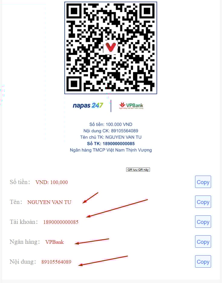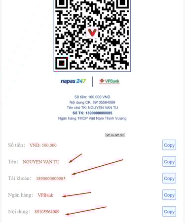 BƯỚC 5 : Rồi cuối cùng bạn chuyển khoản tới STK của 88FC rồi nhớ kèm theo nội dung ck nhé