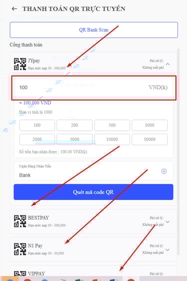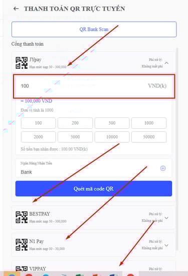 BƯỚC 4 : Bạn hãy nhập số tiền vào rồi chọn bất kì cổng thanh toán nào của 88FC rồi bạn nhấn QUÉT MÃ QR