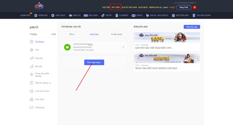 BƯỚC 2 : Bạn hãy đăng nhập vào 88FC và vào phần rút tiền liên kết ngân hàng để có thể nạp tiền